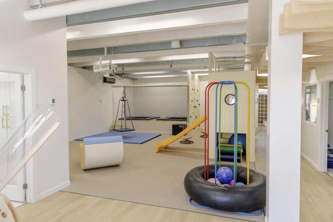 Formerly a downtown bank, Abby's Learning Center is a 3,000 sqft therapy center. This beacon of inclusivity in the heart of Austin was designed to support disabled students, blending function with warmth, and fostering a safe environment for learning.Therapy rooms are organized around a central gym space, encouraging daily fluidity. The interior is anchored by a singular corridor linking the building’s two entrances.Overhead, linear ceiling battens serve as wayfinding, integrated lighting, and acoustic dampening for enhanced privacy in therapy studios. This project re-imagines ABA therapy through a lens of empathy, accessibility, and security.